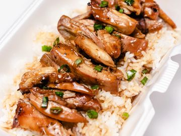 Grilled boneless and skinless chicken marinated in our homemade teriyaki sauce, served over a bed of rice.