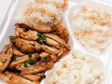 Grilled boneless and skinless chicken marinated in our homemade teriyaki sauce, served with two scoops of rice, and a scoop of mac salad.