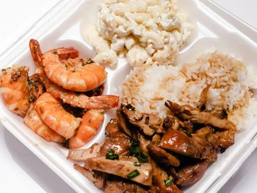 Try our Plate of the Day! Serviced with two scoops of rice, and a scoop of mac salad.